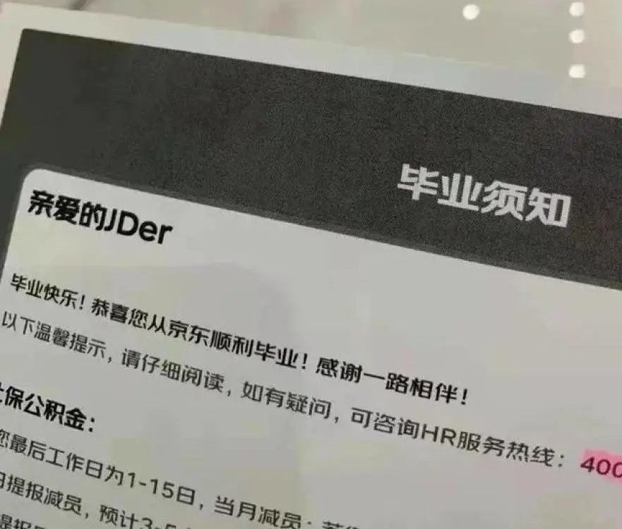 而且京东为了缓解裁员带来的尴尬,京东给被裁的人员发了一张“毕业通知”,其中写着恭喜被裁员的员工“恭喜毕业快乐”,从京东顺利毕业。