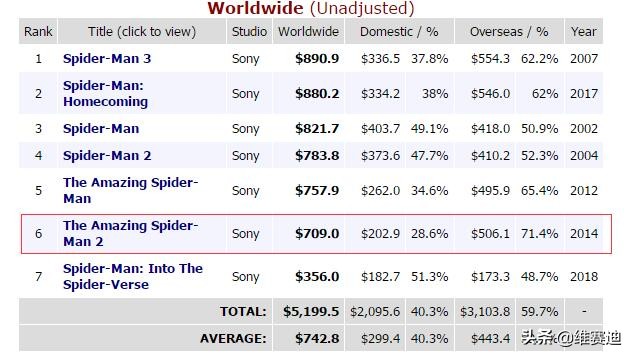 2014年,《超凡蜘蛛侠2》如期推出,但上映后的表现令人大跌眼镜,因影评人、观众口碑集体的负面影响导致在开画票房比前作高的情况下,北美地区的最终成绩只有2亿美元,全球票房则创了新低,堪堪过了7亿。