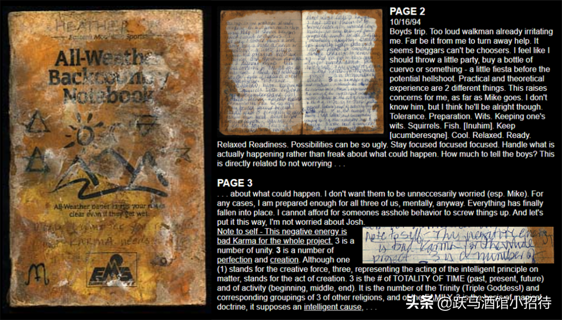 警方在旅行包里找到了海瑟用来记录影片拍摄过程所用的手提式摄像机,其中有三人最后几天的影像资料,这些影像便是我们看到的《女巫布莱尔》正片。不过旅行包里还有一个更为有趣的发现,那就是海瑟的日记,而这些日记可以解答一部分影像资料中让人困惑的地方。