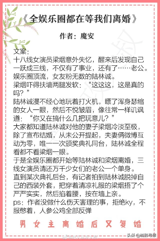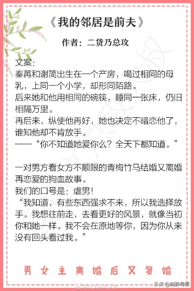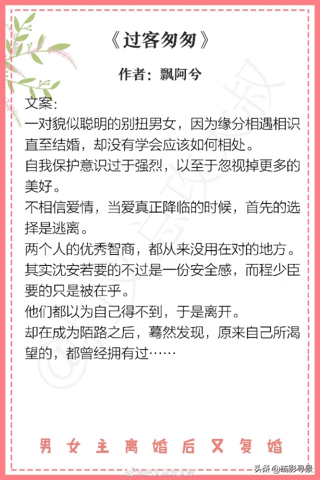 飘阿兮的《过客匆匆》沈安若和程少臣两个人一开始就是将就,两个人的性格又是天差地别,也是婚后比较独立的两个人,离婚是男主提的,是因为两个人的孩子没了,还发现了女主的堕胎预约单,只是身体情况没做。分开后,程少臣觉得还是她最好,离不开她,以工作的名义开始了漫漫追妻路,有甜有虐。