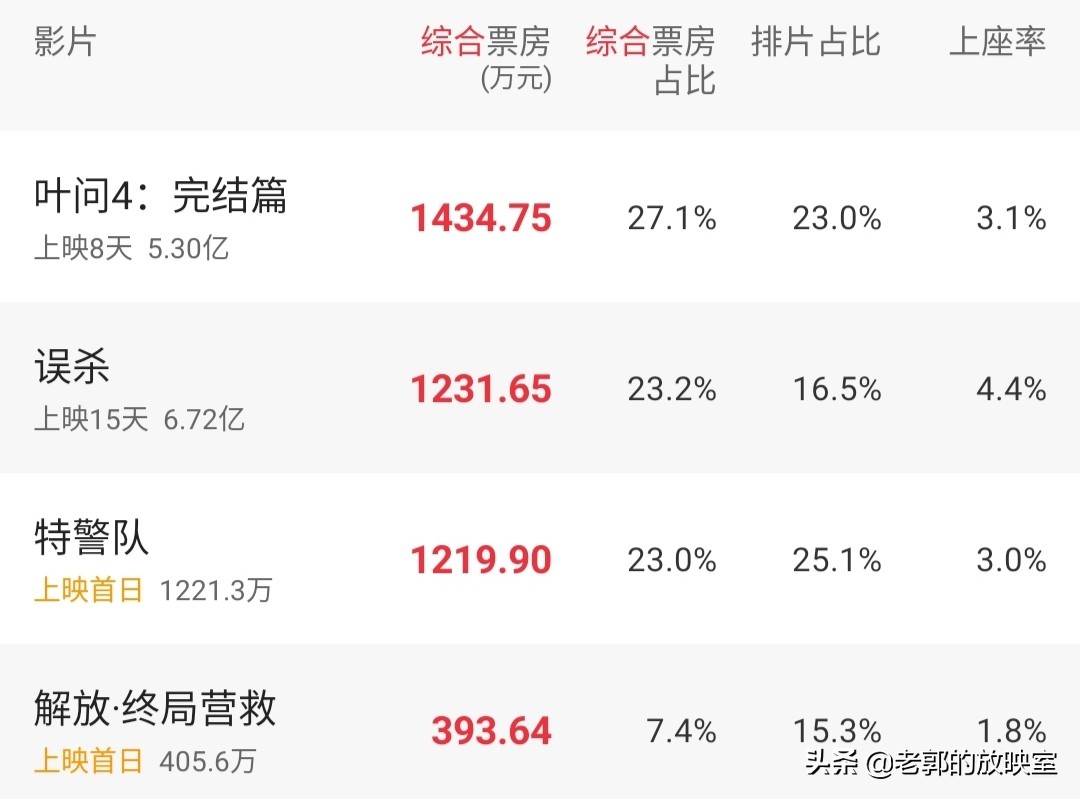 截止到27日16时,《特警队》票房突破1200万,虽然势头强劲,但依然不敌电影《叶问4:完结篇》和《误杀》,如果说《特警队》票房是差强人意,那电影《解放.终局营救》只能用“惨”字来形容了,仅取得了400万票房,排片占比甚至不如已经上映了15天的《误杀》。