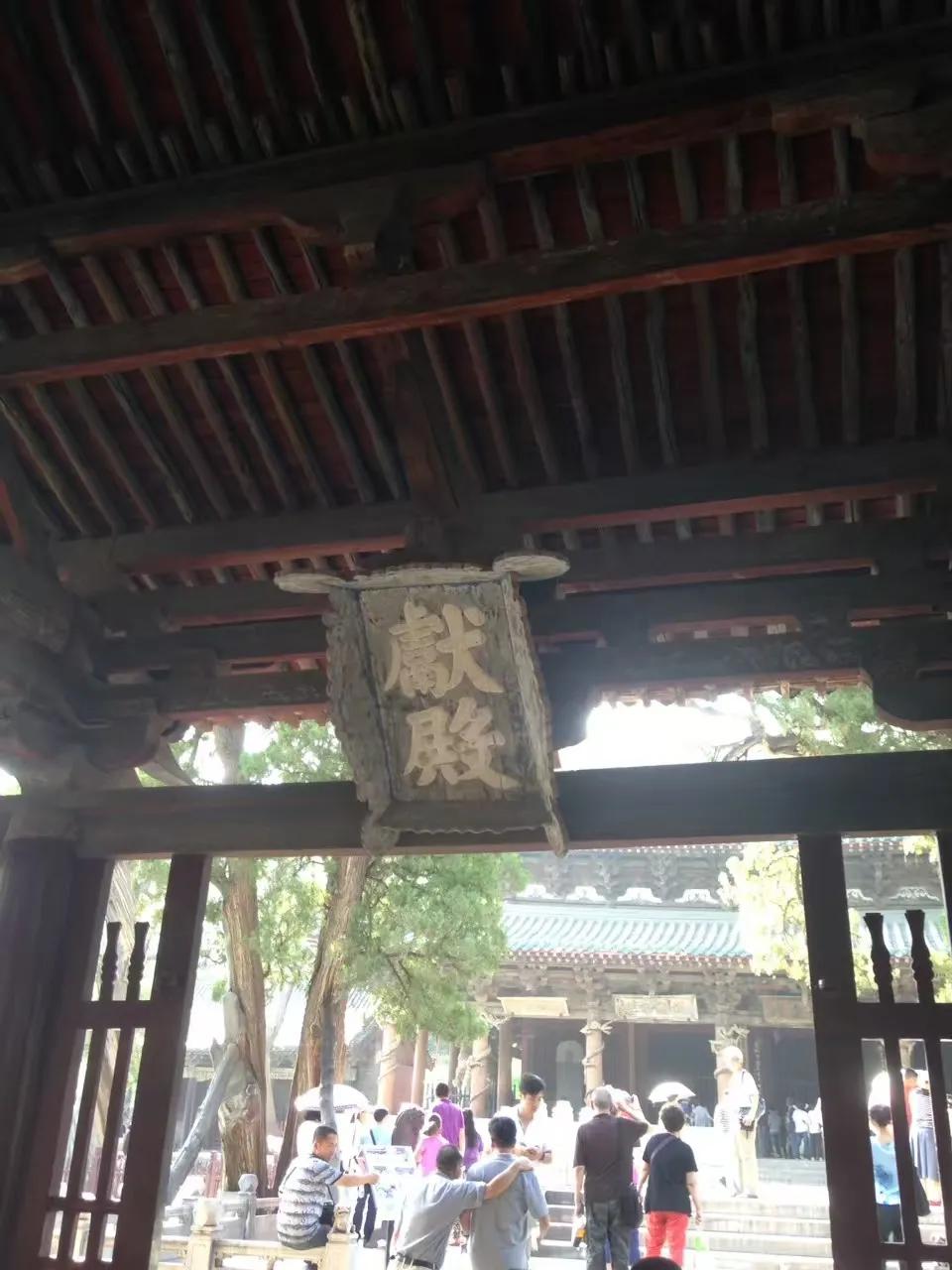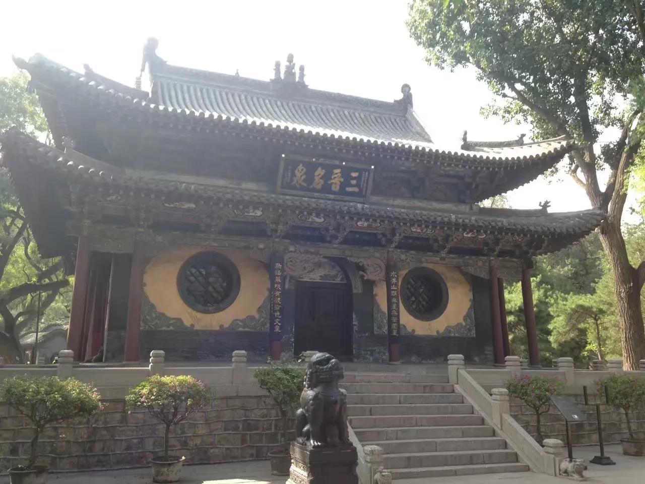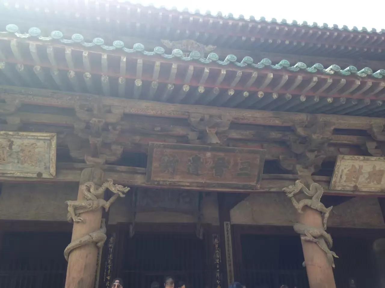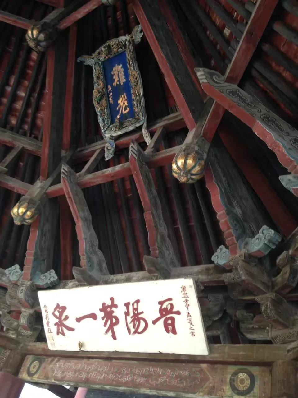 “结飞梁于水上”。即“晋中三宝”之一的鱼沼飞梁,建于北宋政和八年(公元1118年)。古人把方形鱼池称为鱼沼;梁即桥梁。在边长约19米的方形鱼池上建造一座可通往东西南北的交叉十字形桥梁,府看如同大鹏展翅,故有飞梁之称。只是可惜的是该胜景已不复存在,现今所能见到的鱼沼飞梁是07年以后重修的。桥东西两端分别连接“晋中三宝”之二的圣母殿和献殿,两殿分别建于北宋时期。十四年前来的时候还能入殿参观,而今也只是“门外观景”了。