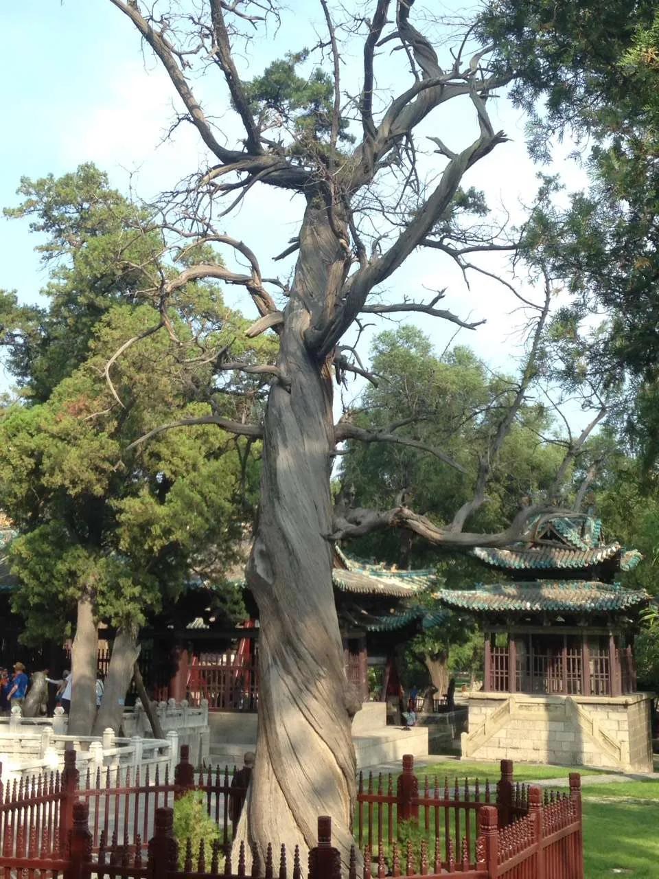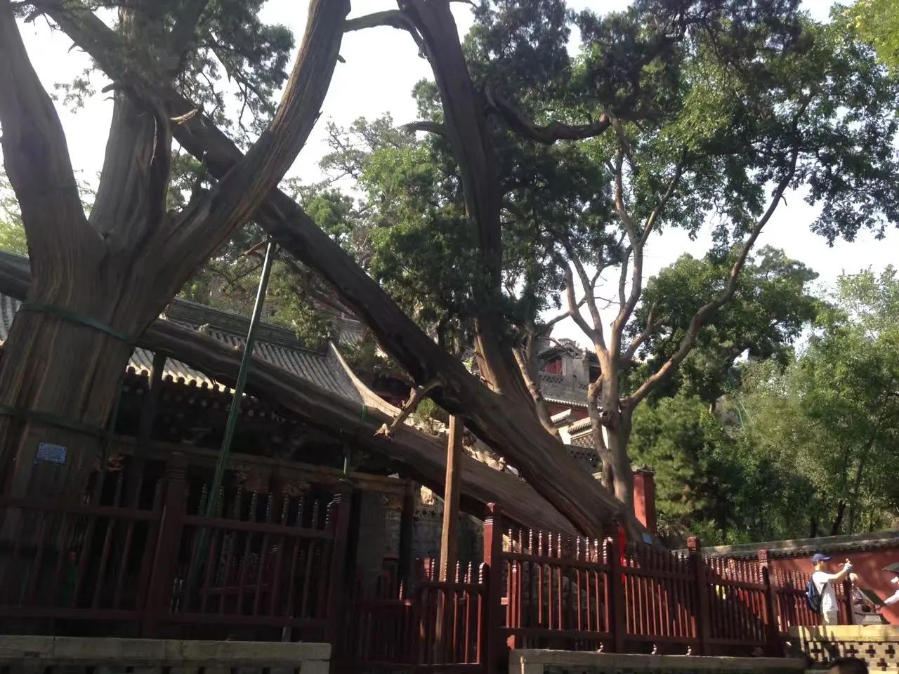 还有被称为“晋祠三宝”的宋代难老泉、圣母殿内的43尊宋代侍女像和周代的两株齐年古柏。古柏植于苗裔堂前,向南倾斜45度,如卧龙蛰伏;树高18米,围5-6米。树龄至少也有300年以上。据说此树可给人们带来好运,游客多在此留影。