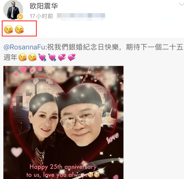 11月26日凌晨,演员欧阳震华的妻子在社交平台上发文,罕见秀恩爱,并配文:“祝我们银婚纪念日快乐,期待下一个二十五周年。”