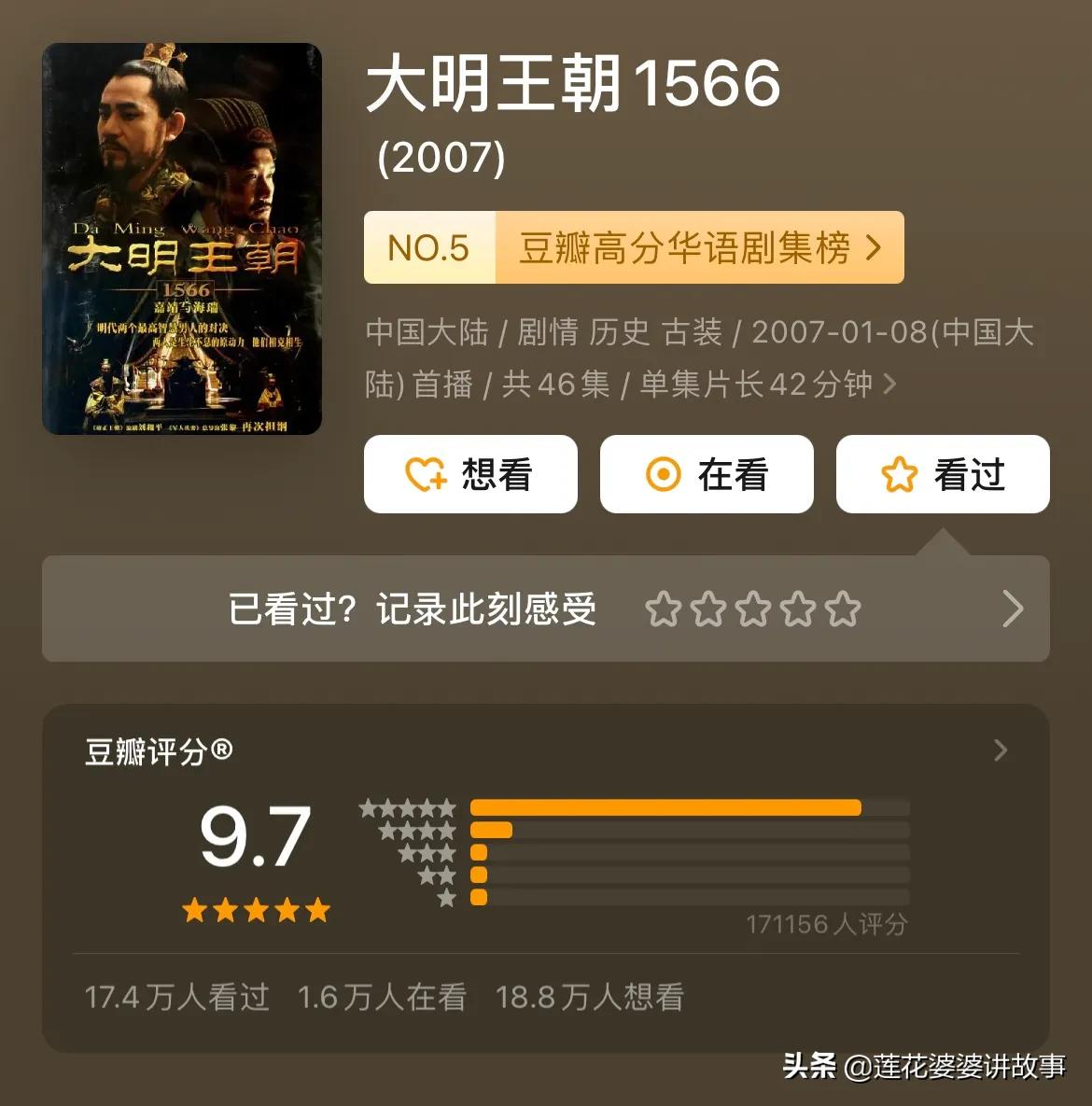 这部历史正剧评分非常牛b,历史正剧剧本很难,什么剧情你得有依据,不像穿越剧,架空剧等随便写,想怎么写就怎么写。但是历史正剧没有一个好剧本,播出时会有成千上万人跳出来指责你改编历史。这个剧的编剧刘和平。你可能不知道刘和平是哪位,简单介绍下《大明王朝1556》《李卫当官》《沧海百年》《北平无战事》《雍正王朝》国家一级编剧。加上一群老戏骨,精彩演绎《大明王朝1556》。