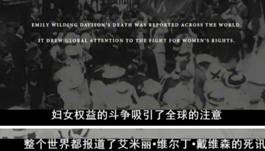 影片的结束,是艾米丽手中捧着“votes for women”的紫、绿、白三色旗帜拼着命冲到国王乔治五世的马前,当即丧生在马蹄下,这才被世界媒体广泛报道,引起政府的关注。艾米丽的葬礼有成千上万的女性自发参加,这样惨烈的死亡终于引起了全世界对于女性基本权利的关注。