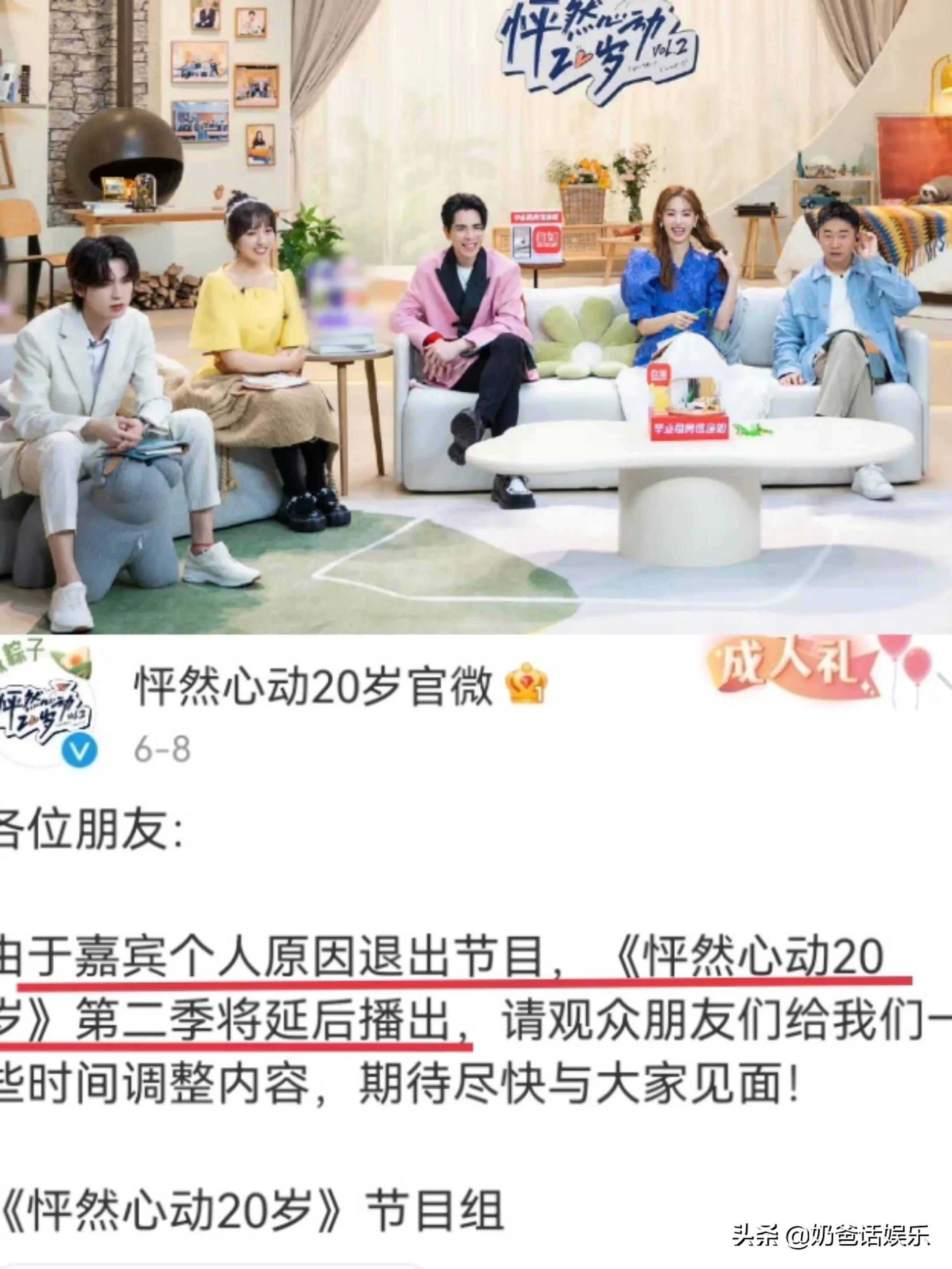 《怦然心动20岁》第二季首播后,因女嘉宾发文声明退出节目,节目组不得不做出延后播出的决定,同时将首播第一期的内容下架,毕竟女嘉宾退出了,需要重新剪辑后方能上线。