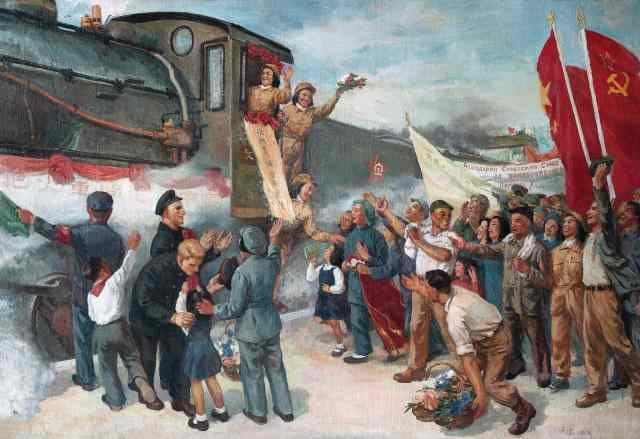 那是一幅挂在车间办公室的油画,画面上,一名苏联女司机从火车驾驶舱伸出半个身子,向窗外挥着手。