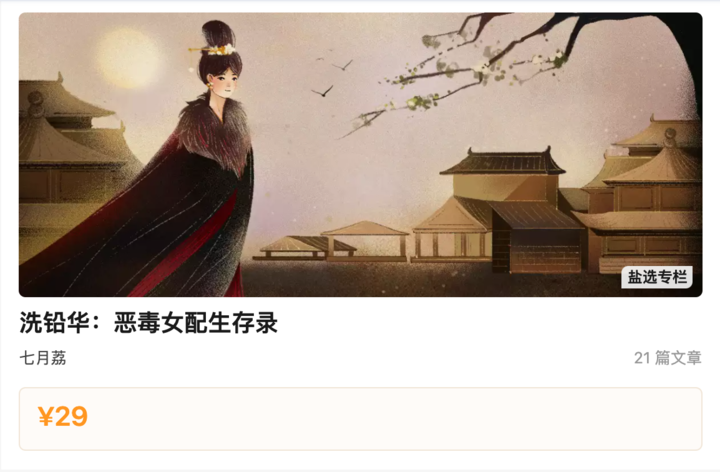 知乎将《洗铅华:恶毒女配生存录》标榜为优秀案例标杆。在 4 月上线后,这个盐选专栏在一个月内就获得了近 40w 的收入。由于没有公布确切的数字,我们就按照单月营收 37.5w 来计算一二,单价 29 元一个订购,那么在那一个月里,有接近 1.3 万个读者订阅了该盐选专栏。