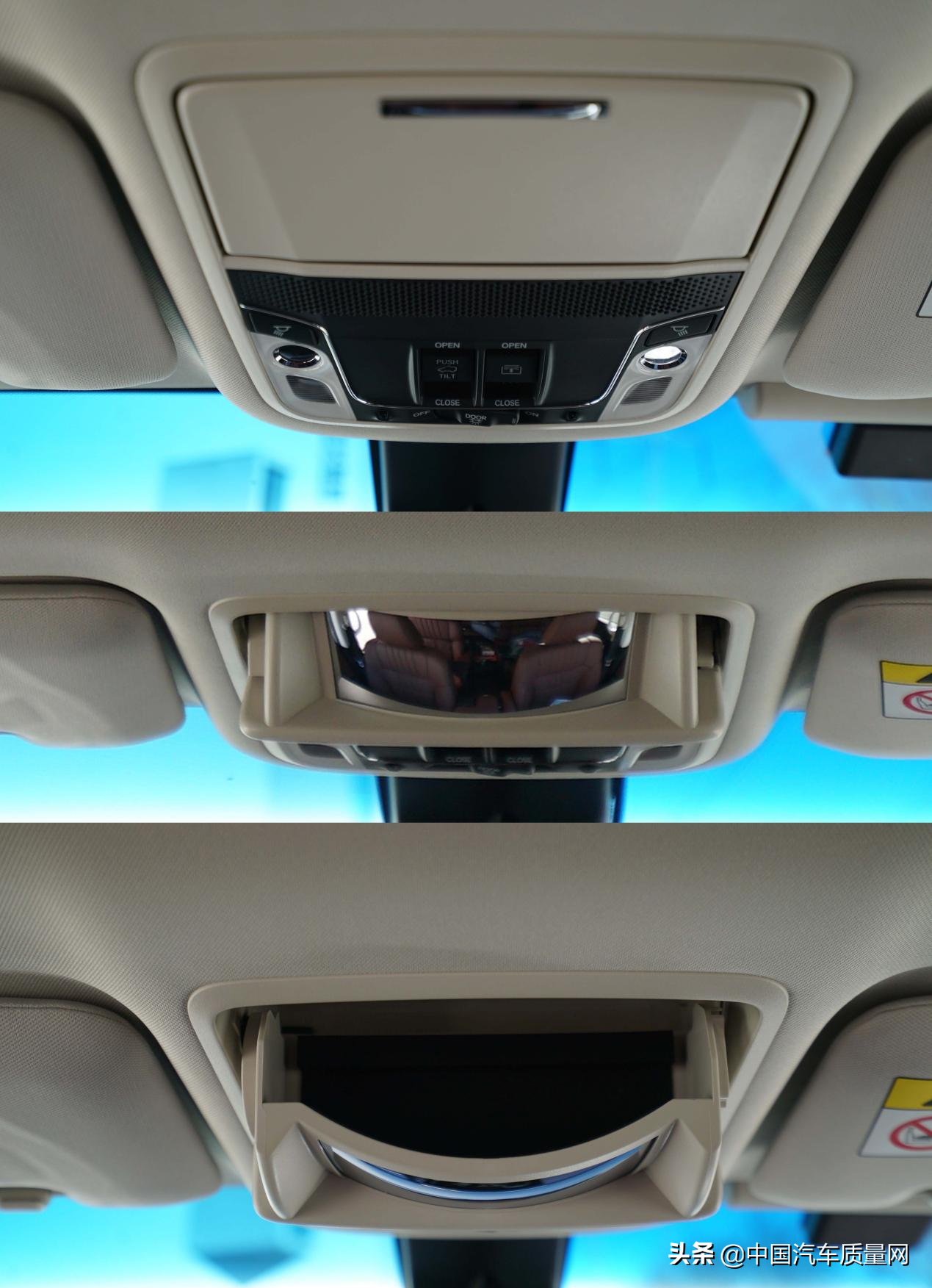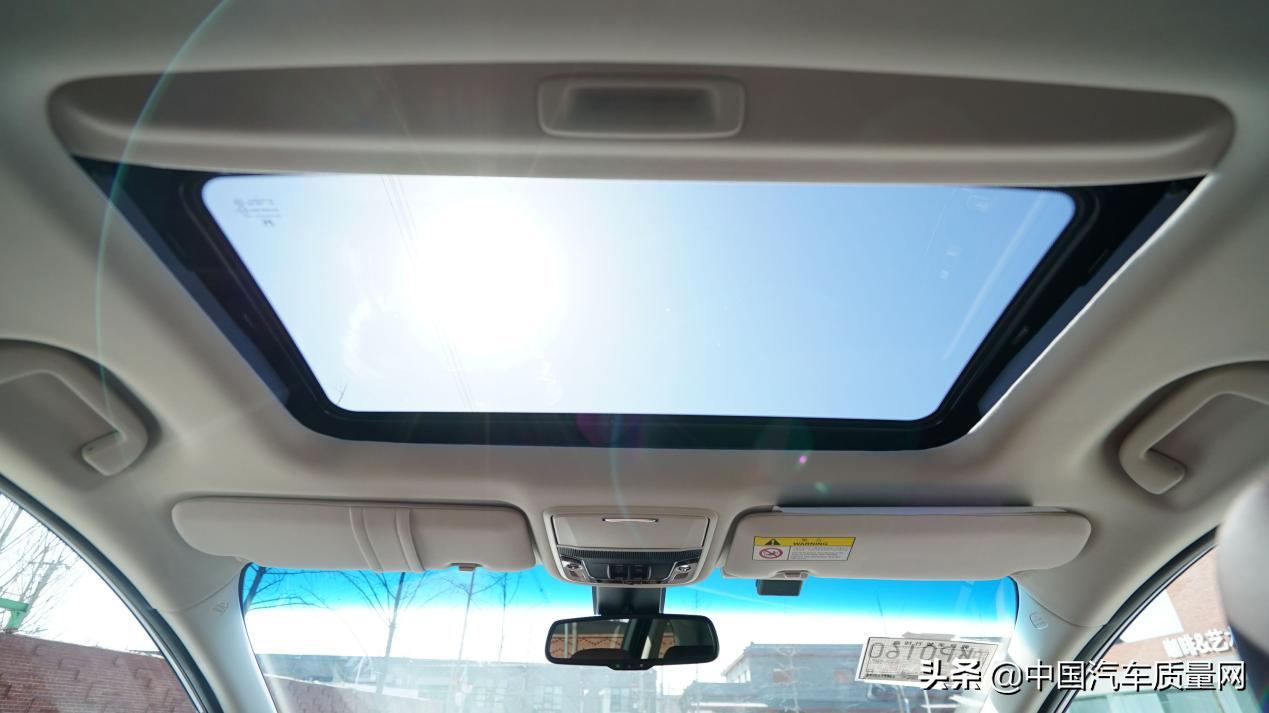 前排顶部配有电动天窗,其遮阳帘为手动,位于前排车顶的控制区域中有第二排天窗遮阳帘的控制按钮。此外,储存太阳镜的位置还集成有一个可以观察全车的凸面镜,对车内环境的一览无余可以让您在关怀车内家人的同时安全驾驶。