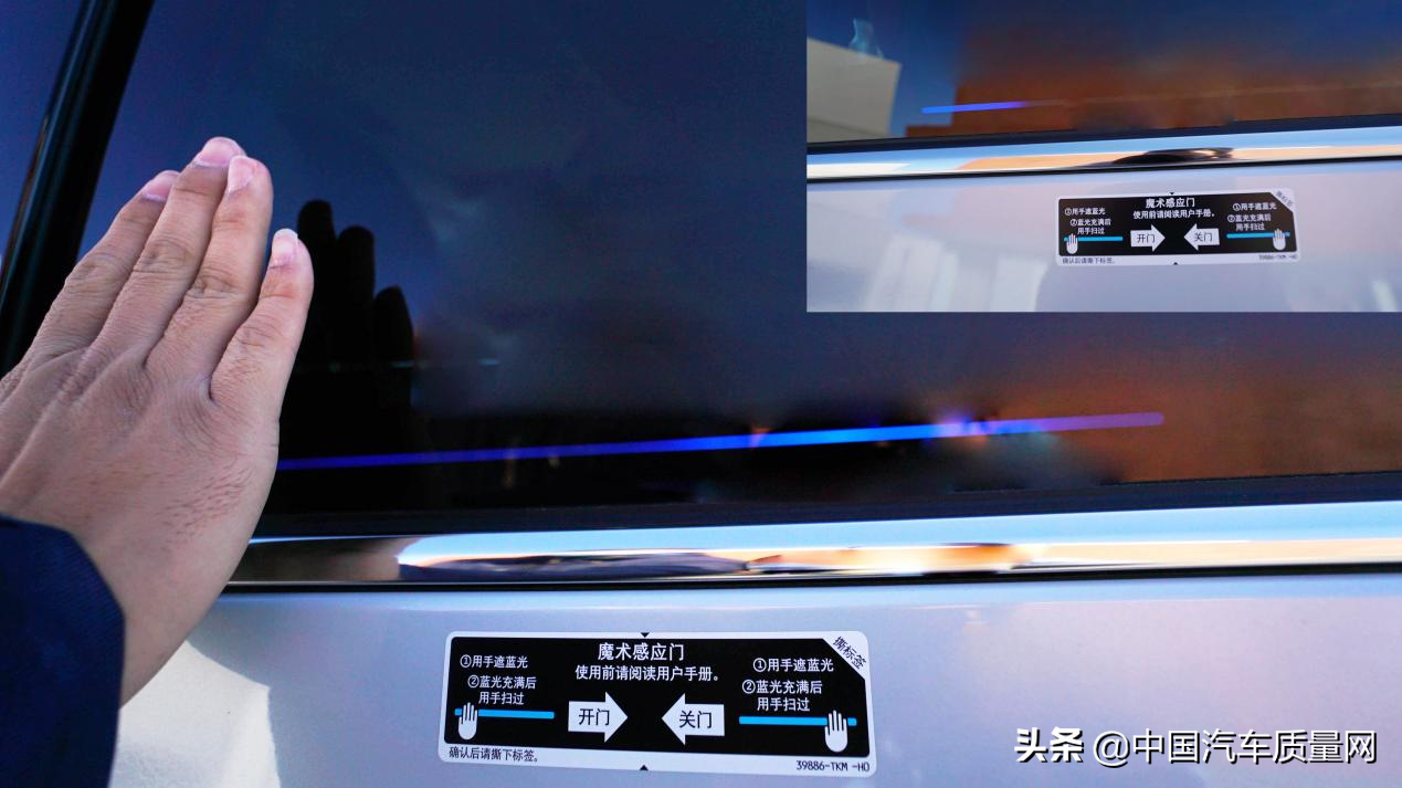 两侧后门均为电动车门,并采用了魔术感应,在将手放在车门的蓝光位置后,待整条光带被充满后再扫过,这时车门便会自动打开,是一项颇具仪式感的配置,但响应速度还是让人略感“捉急”。