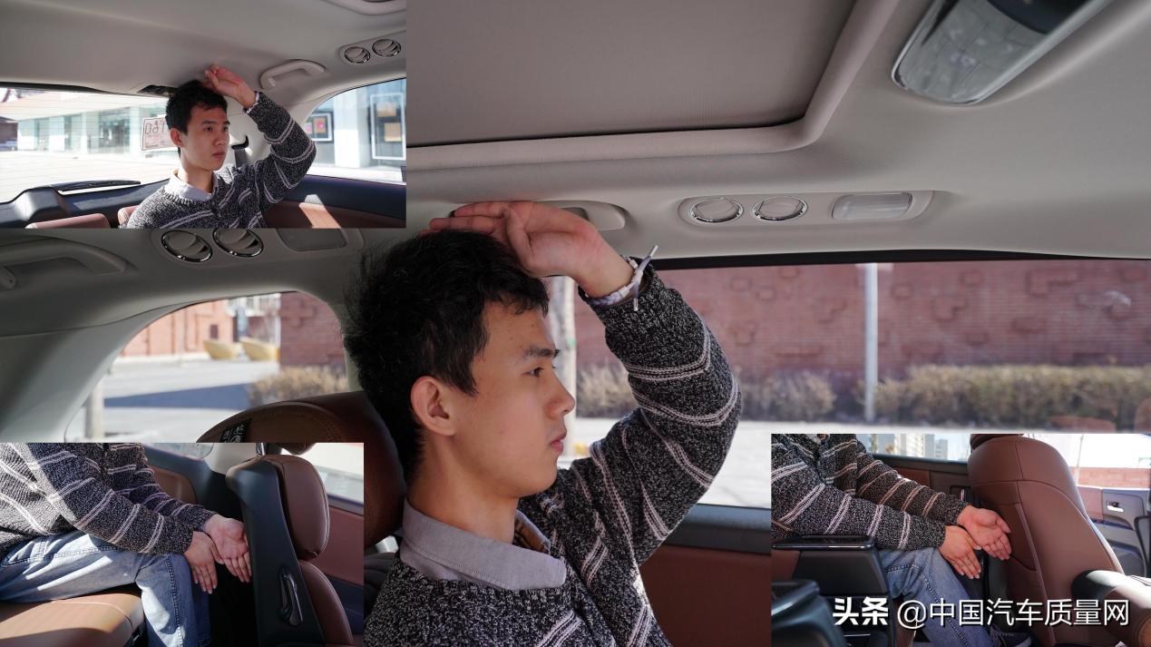 第二排座椅的空间较为充裕,体验者身高为185cm可以看到其头部空间为四指左右,腿部空间为两掌,而最后一排的头部空间较小,约为一指,腿部空间约为两掌。