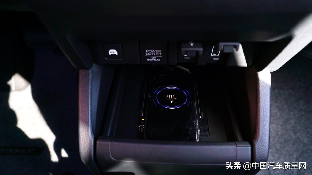在空调控制板的下方是纯电模式按钮与三个供电电源,同时在其下方的储物空间位置配备有无线充电器。