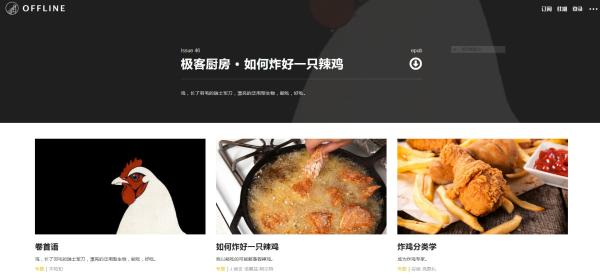 目前在《离线》网站首页展示的是电子杂志最后一期的内容,主题为《极客厨房·如何炸好一只辣鸡》,其中包括编译的文章《炸鸡分类学》、《酥脆的科学,咔嚓咔嚓嘎嘣脆》、《跟着鸡的步伐,就能找到全世界》和科幻小说《多少只鸡能战胜一个人?西伯利亚肉鸡养殖业采风》等。
