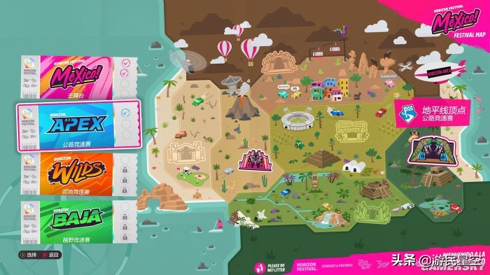 说起任务,本作其实还有个令我感到舒适的改动,那便是游戏对剧情的推进方式更具条理化。这次的“地平线故事”新增了一张卡通地图,当玩家通过传统赛事达到目标荣誉值后,便能在多种赛事门类中选择一项来进行。