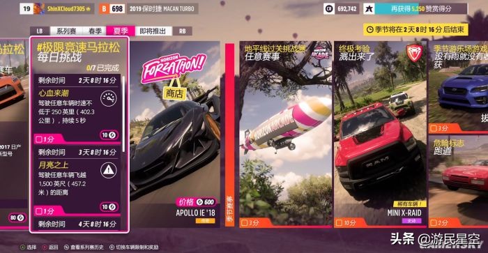 相比于前作那种将能够进行的赛事全都一股脑的标记在地图上的做法,《极限竞速:地平线5》通过这种巧妙的处理方式,大大简化了地图页面所承载的信息量,同时也避免了玩家面对地图上密密麻麻赛事而不知所措的情况。
