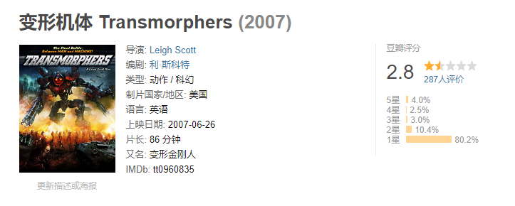 超评:我是从某个部分开始看起,中文配音,听到有人叫“擎天柱”,我使劲找,找不到,把电脑接到43寸液晶电视上还是找不到,三分钟后再也无法忍受,遂闭之!