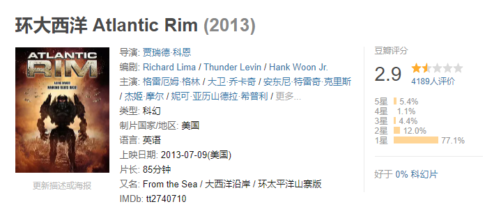 4.山寨之王the asylum公司出品的山寨版《环太平洋》------《环大西洋》豆瓣评分2.9分