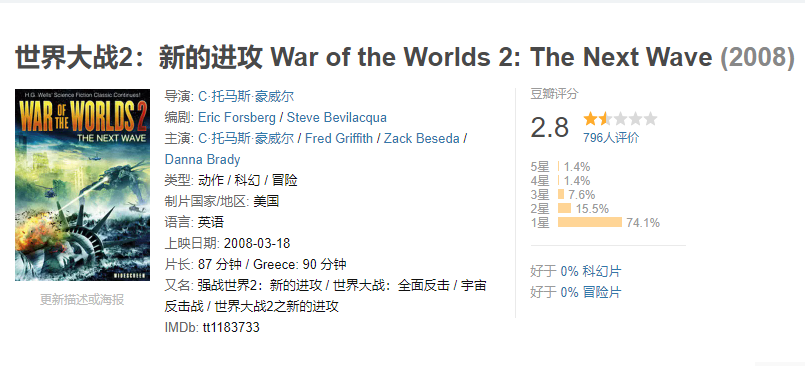 2.山寨2005年汤姆?克鲁斯出演的《世界大战》-------《世界大战2:新的进攻》豆瓣评分2.8分