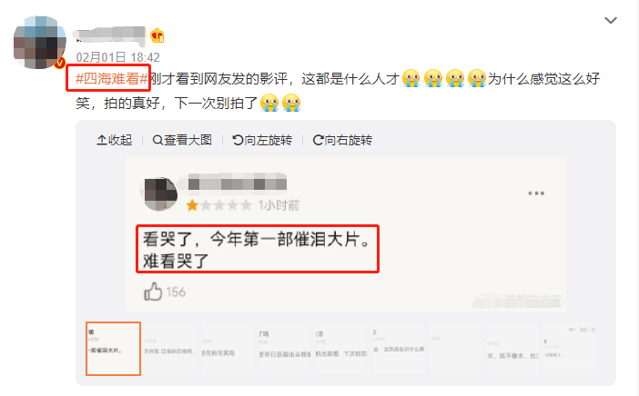 上映后《四海》的评论区可是沦陷了,不断遭到网友的狂怼,甚至“四海难看”简简单单的四个字还一度成为了热搜词条,甚至有人表示“难看哭了”。