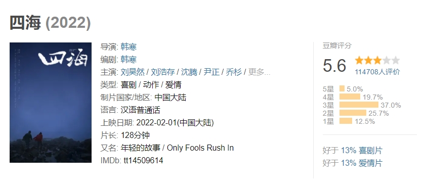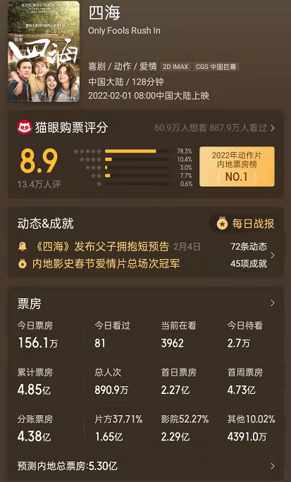 不过可以看出《四海》的首日票房就已经高达2.2亿,后面势头不足最大的原因主要就是口碑问题。