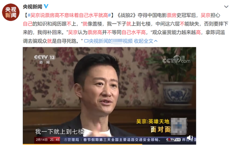 此时不禁让人想起吴京接受采访时说的话:票房高不等同自己的水平高,观众鉴赏能力越来越高,那陈词滥调骗观众就是“自寻死路”。