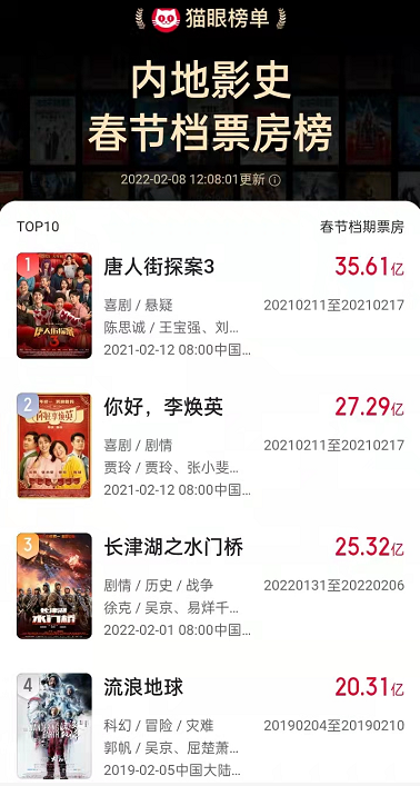 要知道刚开始势头最猛的《唐探3》首日票房就突破了10亿,而《你好,李焕英》后来居上前的春节档票房也突破了27亿。