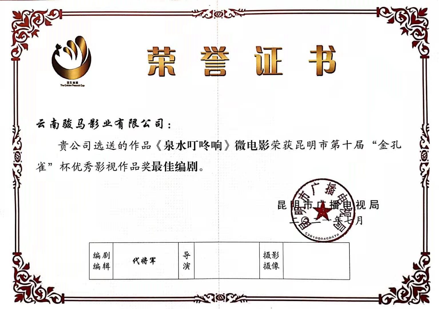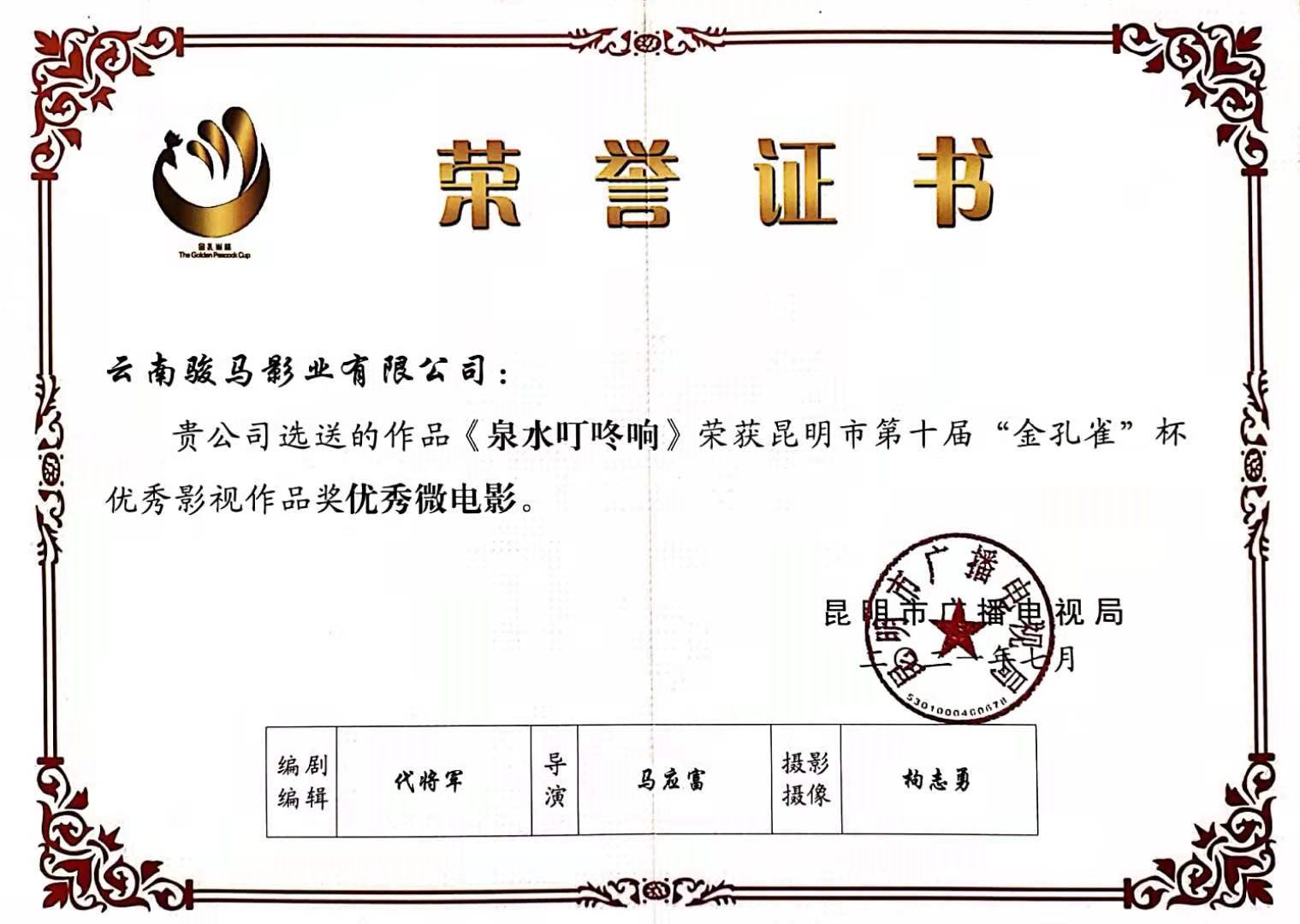 由云南骏马影业有限公司报送的微电影《泉水叮咚响》斩获优秀微电影、最佳编剧两项大奖。《泉水叮咚响》是电影《润如泉》精简版。《润如泉》已取得上线备案号,并被评为云南省文艺精品,近期将在全网上线播出。