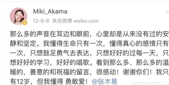 很多人都在谴责张木易是个“恋童癖”“变态”,但是两人充耳不闻,时常在微博上晒晒恩爱,晒晒自己新出的歌曲,也算是幸福感满满。