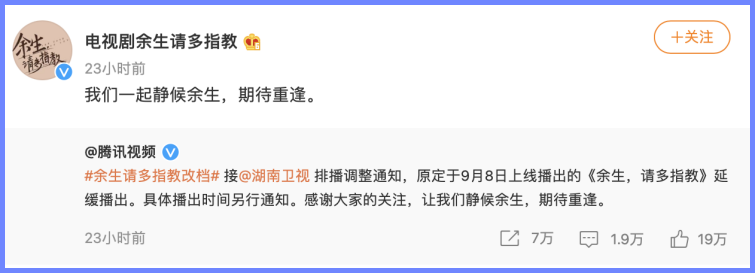6、9月5日,由肖战杨紫主演的《余生请多指教》宣布改档延期,播出时间另行通知。