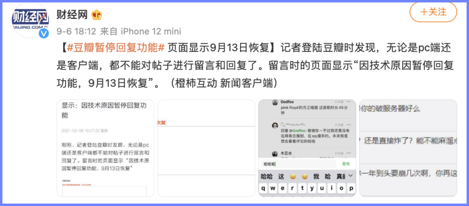 5、9月5日豆瓣暂时关闭留言和回复功能,预计9月13日恢复。