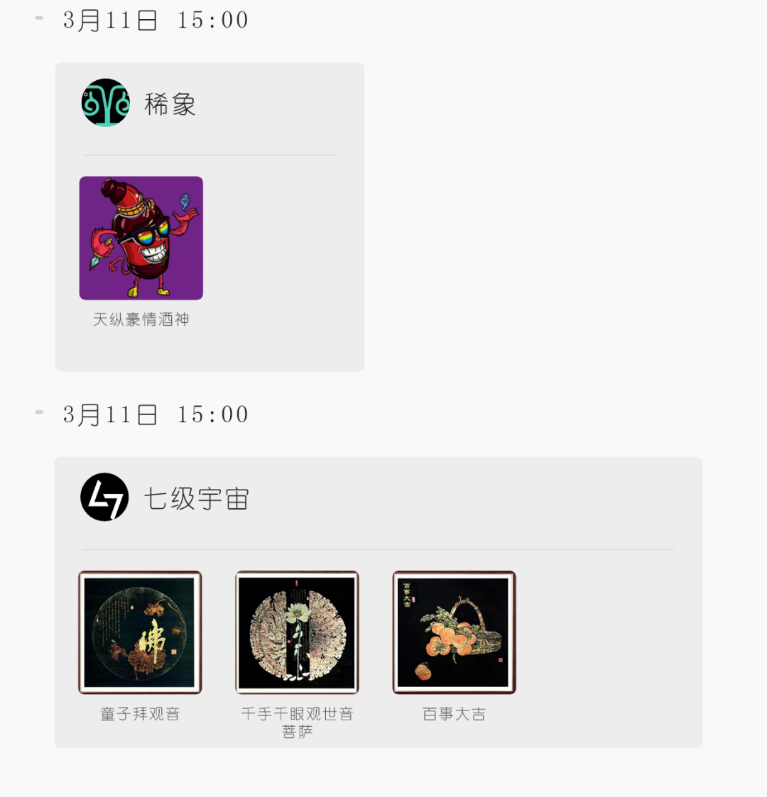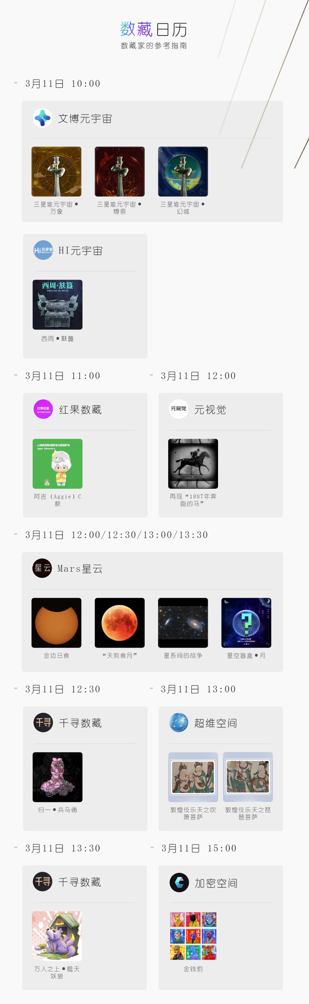 “ 3月11日上架西周文物?簋,三星堆3款,敦煌新品,星空元宇宙系列4款和国博之鉴数字藏品。”