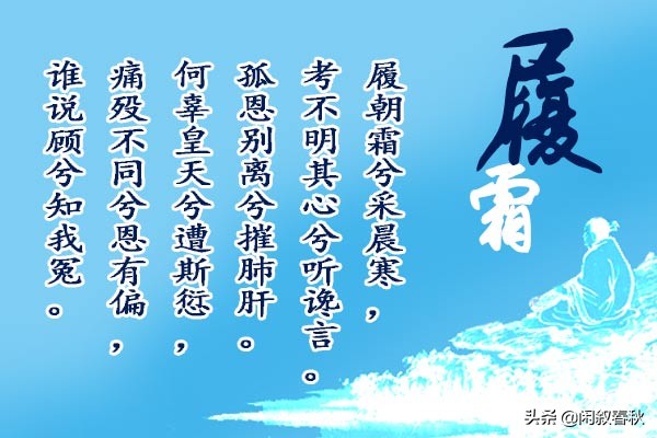这个故事还是蔡邕《琴操》中给出的,说的是伯奇被放逐后生活凄苦,只能用水中的荷叶编成衣服遮体,采花草而充饥。但即使这样伯奇也没有对父亲怀有一丝恨意,只是感伤自己的命运的悲惨。最后他也仅以自己清晨脚踩寒霜的真实感受,作了一首名为《履霜操》的歌来排解心中烦忧。