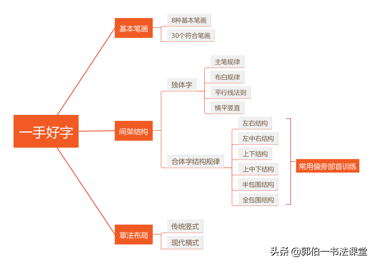 3、通过笔画和间架结构学习,30天左右基本能够写好很多常用汉字了。这个时候就可以总结性的学习一些常用偏旁部首,练习更多汉字的书写了。记住一点,没有必要将全部汉字都练到精熟,只要是掌握汉字结构规律,就能写好每种结构的汉字了。大家可以参考@郭伯一书法课堂“专栏”里的《汉字间架结构8大规律经典解析》进行全面学习。