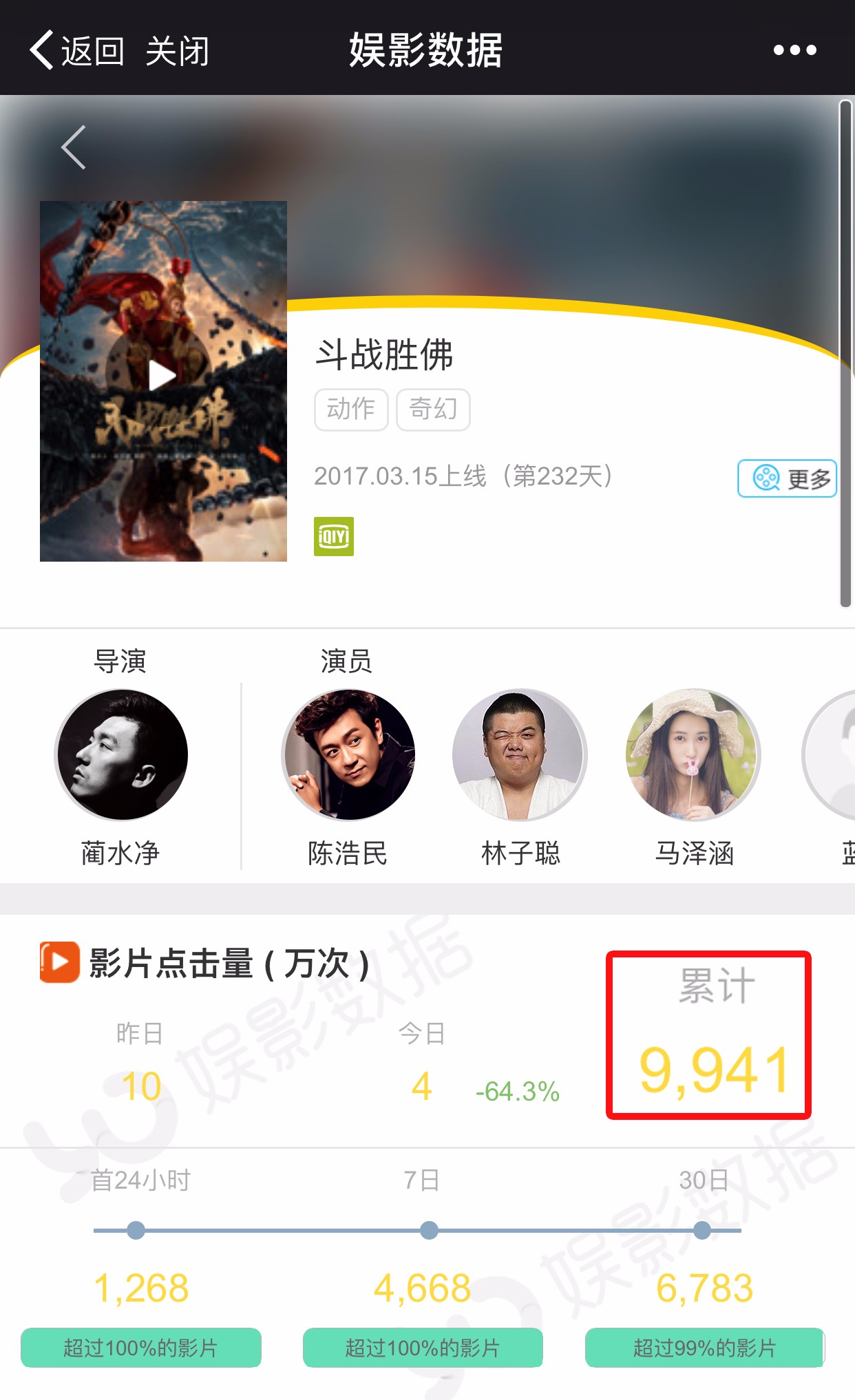 《斗战胜佛》在网大界的影响,目前来说还是无人撼动的。15天2007万的票房分账(目前已超过2600万),真的是让人羡慕嫉妒恨呀。除去片中陈浩民、林子聪的搭档外,本片的片名也被业内众多人士认可。