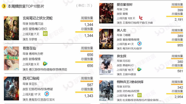 如在娱影第40周的周报中,播放量前十的影片中,从作品片名上还是很容易锁定影片类型的。《玄魔笔记之妖女灵蛇》是魔幻类型、《西河口秘闻》是悬疑题材、《爱在蜜夜时》是爱情题材、《特种兵王2使命抉择》是军事、动作题材等。