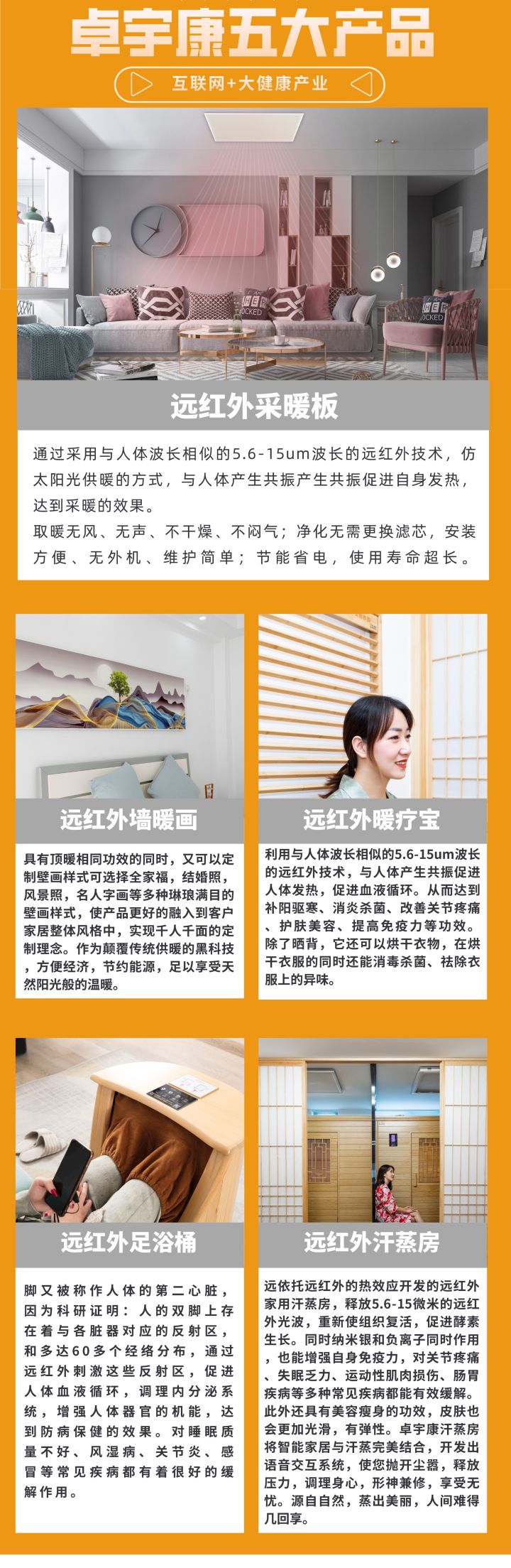 卓宇康是湖州卓欣环保科技有限公司旗下的环保采暖大健康项目。卓宇康系列产品采用远红外线、纳米银、负氧离子等多项科学技术,是一款集健康采暖、净化空气、防霉除湿、理疗养生于一体的创新型产品。系公司与诸多科研人才共同研发的高科技环保产品,已取得多项检测认证。