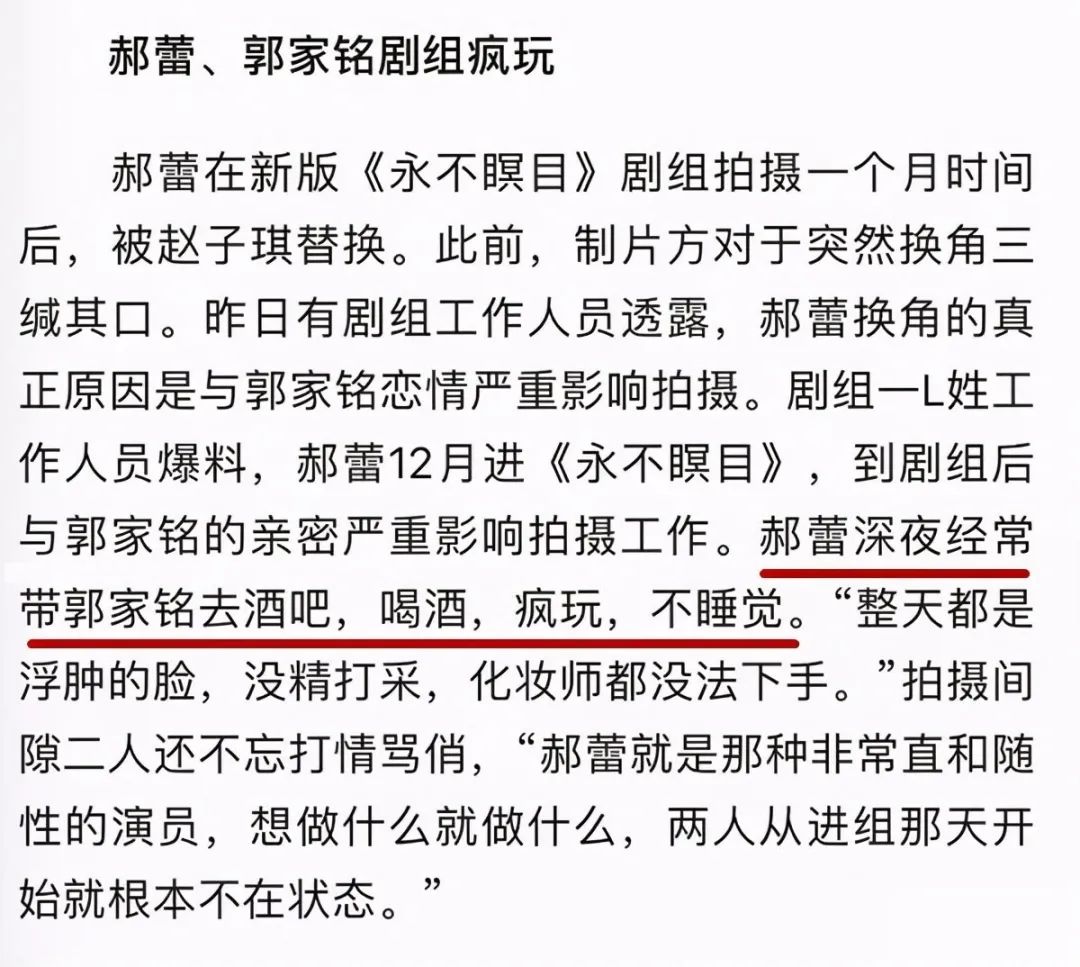 2010年初,电视剧《新永不瞑目》拍摄期间宣布换角,女一号郝蕾被换成赵子琪,有爆料称是因为郝蕾与郭家铭恋爱影响了拍摄进度,两人喝酒疯玩,导致郝蕾根本不在工作状态。当时双方工作人员都出面否认了这一说法。