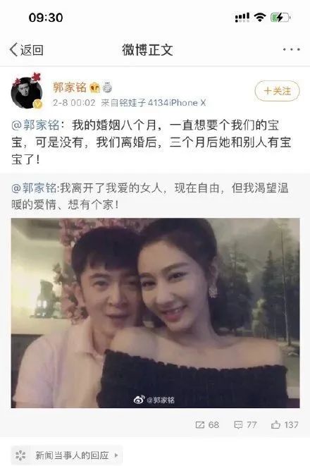 《上阳赋》里,憨憨太子子隆下线了,不知道是不是想趁此热度火一把,不要让大家遗忘他,昨晚凌晨,饰演子隆的演员郭家铭晒出与前妻的合影宣布离婚:“我的婚姻八个月,一直想要个我们的宝宝,可是没有,我们离婚后,三个月后她和别人有宝宝了”。