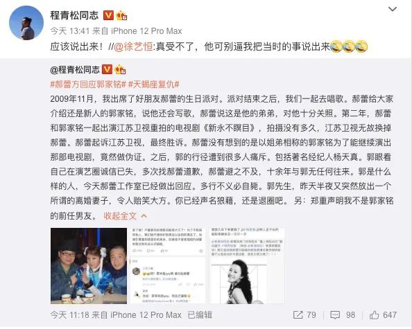 @程青松同志也发了长文,喊话:“十年前出卖灵魂,十年后成为笑话,郭家铭你还记得十年前我也这样骂过你吗?”更直言:“郭的行径遭到很多人痛斥,包括著名经纪人杨天真。”还郑重声明自己不是郭家铭的前任男友。