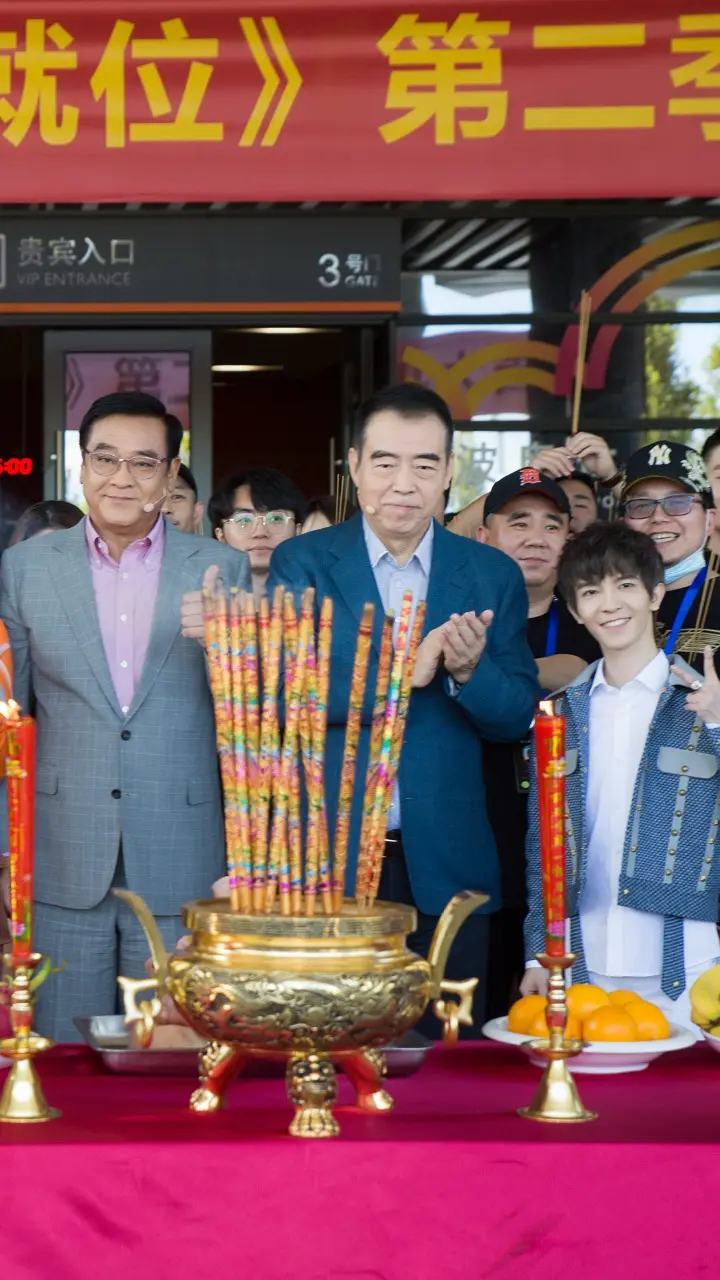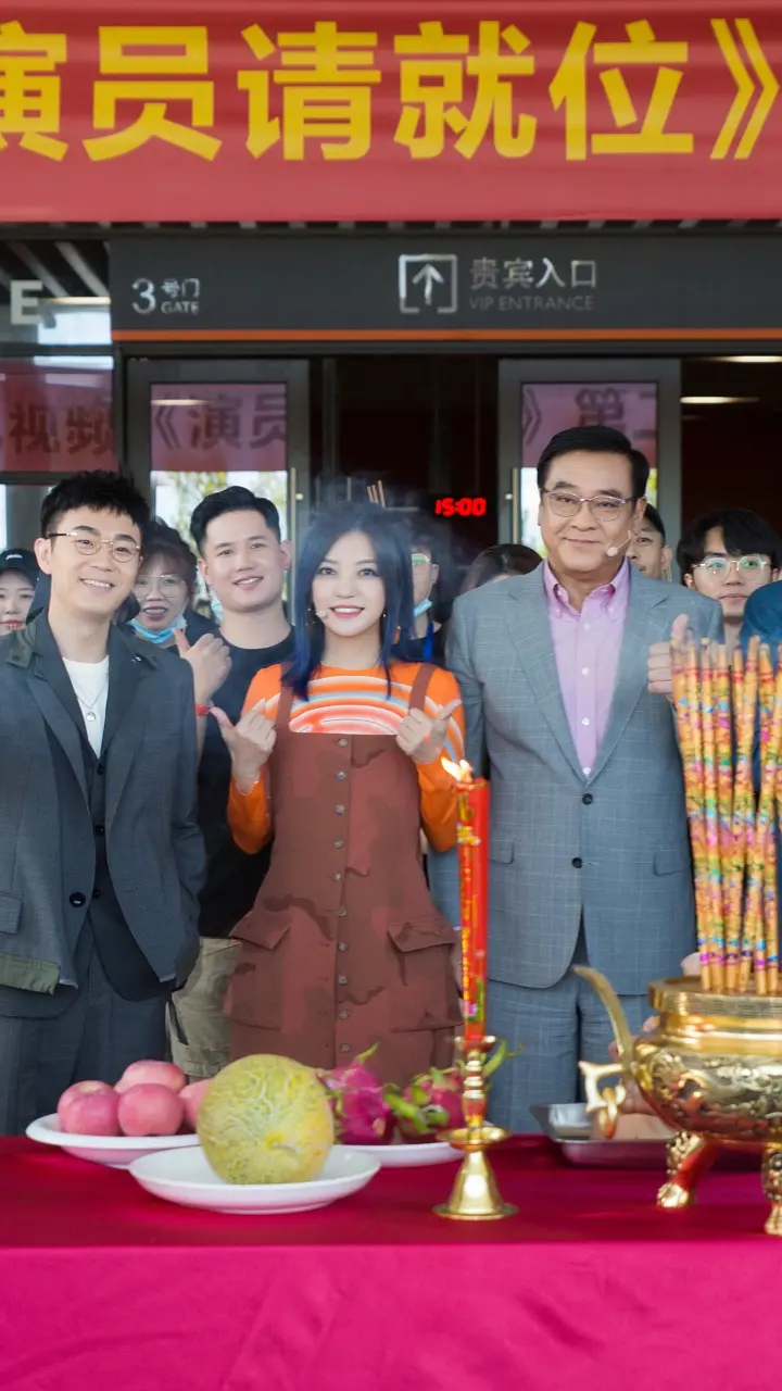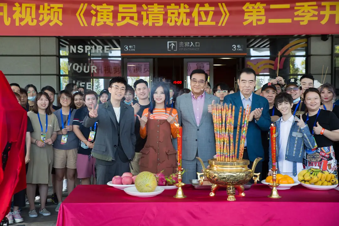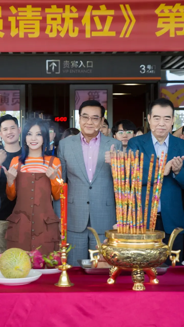 从合影中看,尽管是一档综艺节目,但还是效仿电影开机的传统,在现场摆上了香案,蜡烛和水果等,举行了正式的开机仪式。