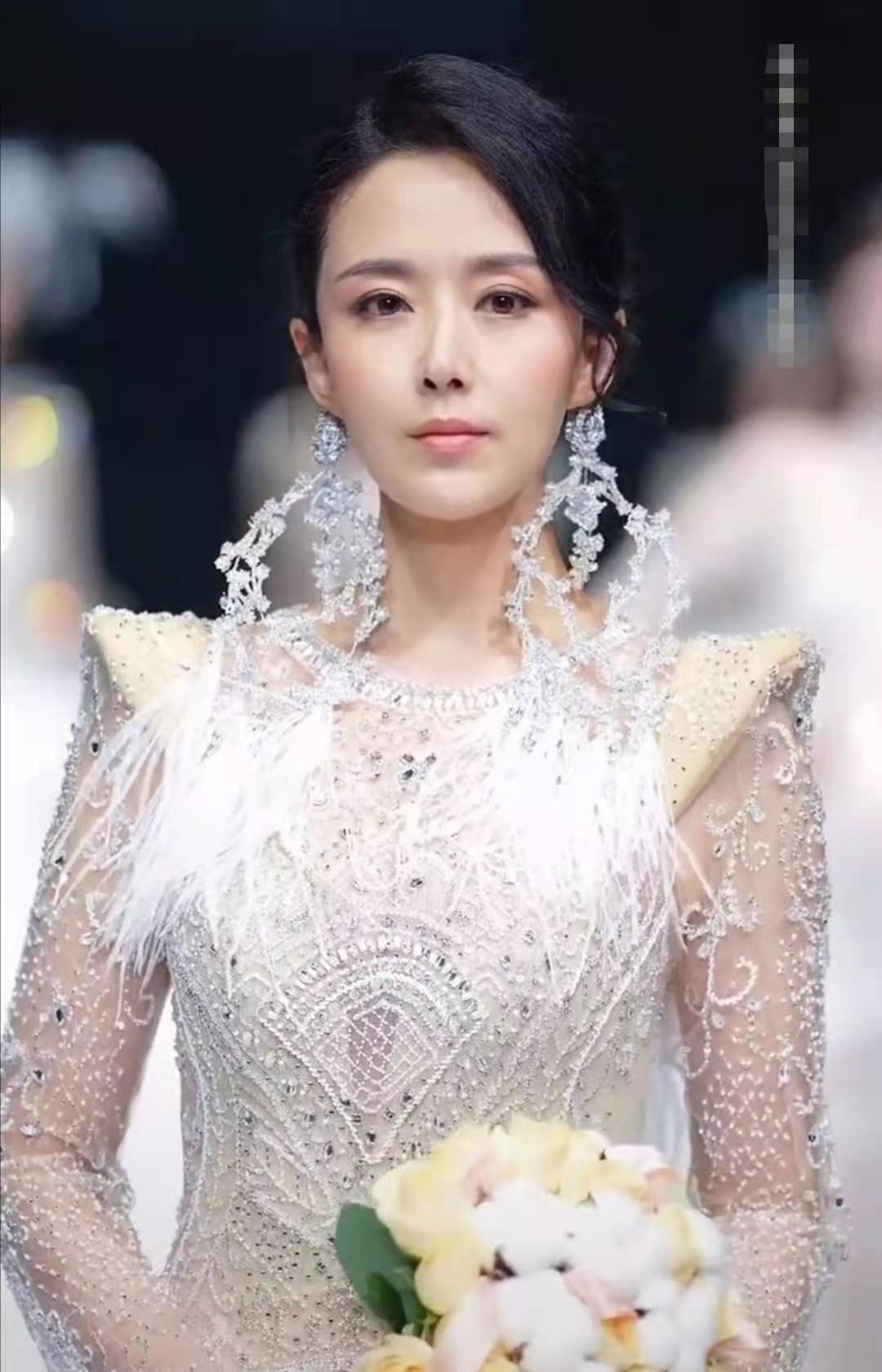 她手捧一束花,眼神坚定地向镜头走来,抬头那一刻简直让人惊艳,43岁的她状态竟然还可以保持如此之好。