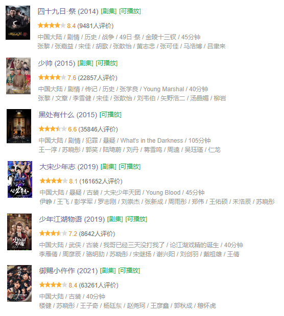 8.4分的《四十九日·祭》,7.6分的《少帅》,6.6分的《黑处有什么》,8.1分的《大宋少年志》,7.2分的《少年江湖物语》,8.4分的《御赐小仵作》。