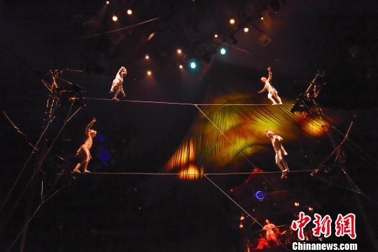 中新网上海10月1日电 (王笈)高空吊环、高椅、柔术、高空钢丝……享誉全球的加拿大“国宝”太阳马戏1日起在上海黄浦江边开演剧团的经典剧目之一《kooza》(《浪迹天涯》)。