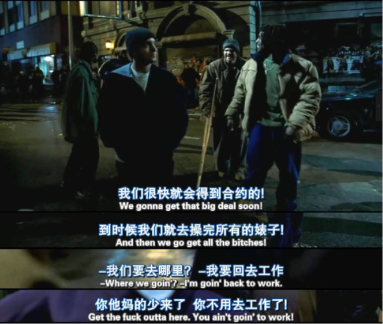 《八英里》是对阿姆的一个概括,酷的表象下,是一个悲惨的故事。此片是r级片,即指电影台词又黄又暴力,毕竟是贫民区。导演在此片没有回避说唱世界的残酷现实,说唱的起源本身就是在街头,来自于贫穷的黑人,来自于破旧的房子,他把判断权留给观众,让观众自己做出价值判断。