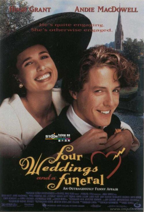 电影由休·格兰特,安迪·麦克道尔主演。主要讲述了查尔斯(休·格兰特饰)在参加四个婚礼与一个葬礼的途中,从一个恐惧婚姻的人寻觅到属于自己的爱情。