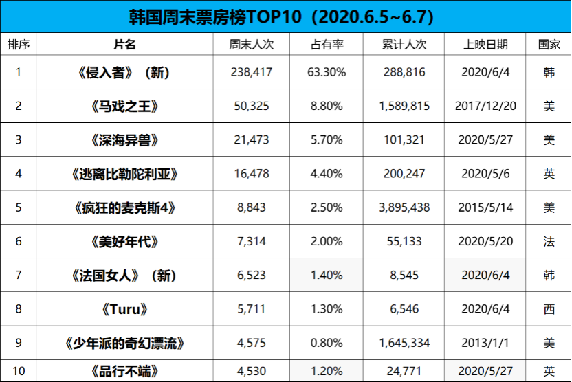 韩国过去几天的每日新增病例都超过50例,疫情还尚未完全受控,不过在有关部门推出的“六折优惠券”大型促销活动助推下,上周全国恢复运营的银幕数已强劲反弹至1300块以上,环比暴涨超过100%,电影业复苏进程明显加快。上周开画的本土片《侵入者》创下疫情影响以来的最佳开画成绩,周末人次大盘环比也狂飙超过135%,创下2月底以来的最好表现。其他老片方面,重映的歌舞电影《马戏之王》大幅逆跌,稳居周末票房亚军。科幻恐怖片《深海异兽》和英国电影《逃离比勒陀利亚》分别排在第三和第四,重映的《疯狂麦克斯》跻身周末前五,同时《少年派的奇幻漂流》也凭借重映挤进周末前十名。