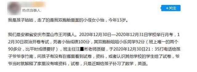 2021年元旦,安徽一名13岁的初中生投河自尽。