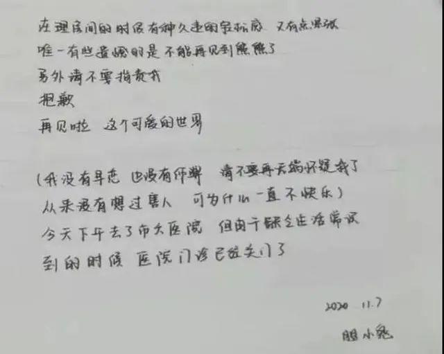 在她留下的遗书中,有这样的字句:“再见啦,这个可爱的世界。我没有早恋,也没有作弊,请不要无端怀疑我了。”