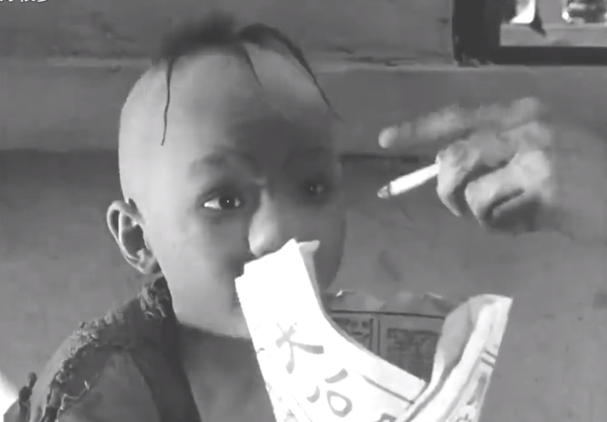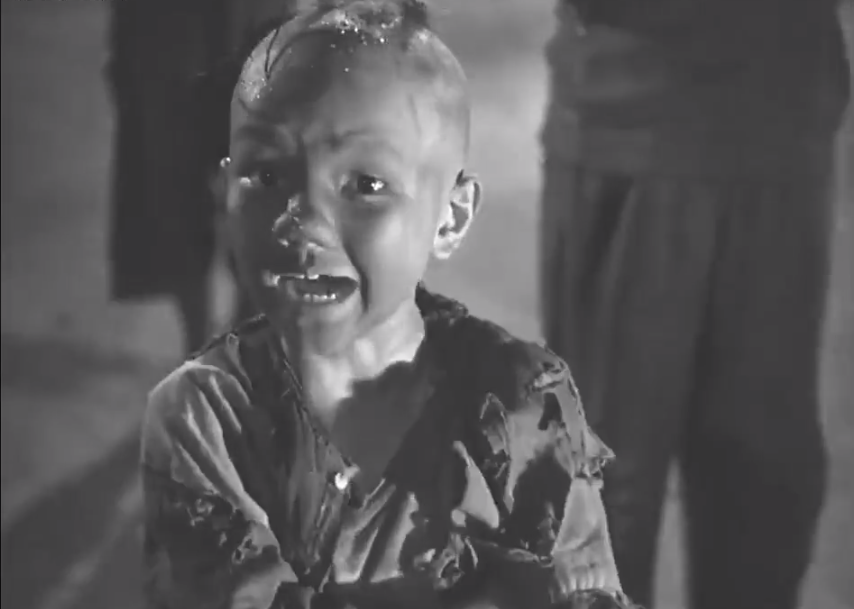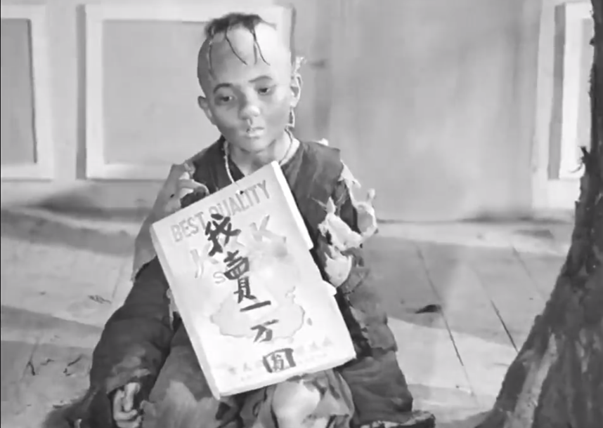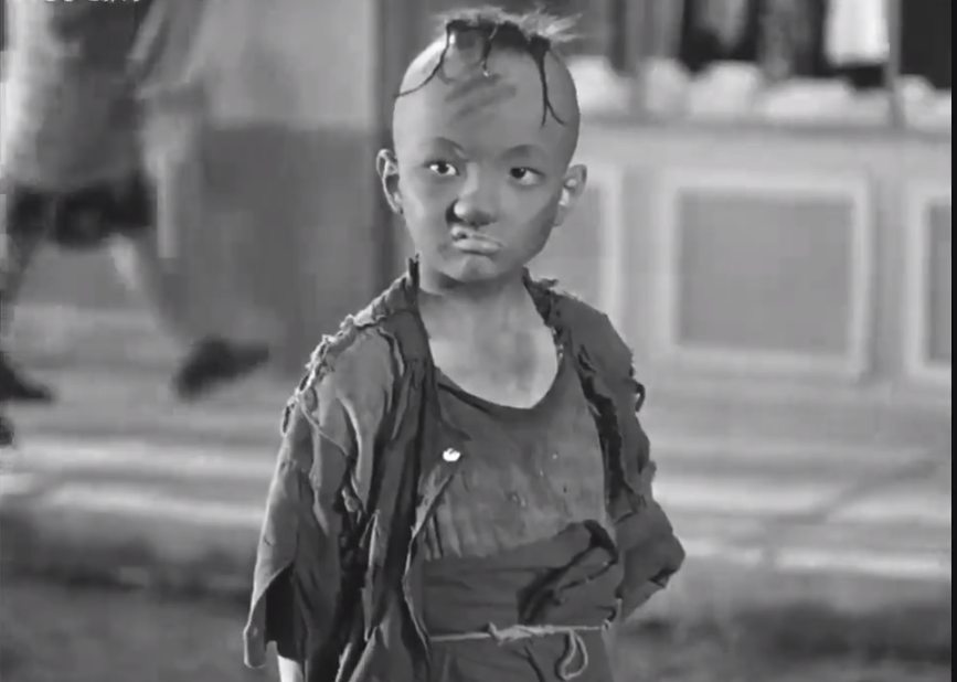 有意思的是,韦廉也曾在《三毛流浪记》里客串过,就是这个面色忧郁的小男孩,此时他正坐在三毛努力推动的人力车上。